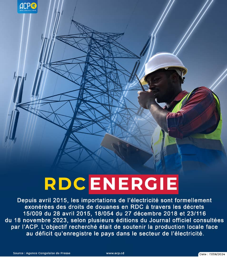 Les importations de l’électricité sont formellement exonérées en République démocratique du Congo, conformément aux décrets signés par l’autorité gouvernementale compétente pour pallier au déficit dans le secteur, selon plusieurs éditions du Journal officiel consultées samedi par l’ACP.
