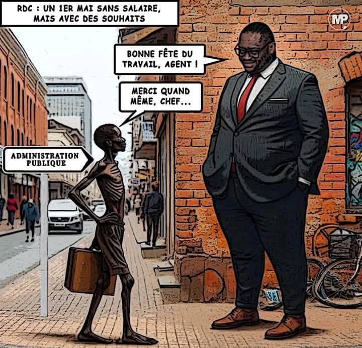 1er mai en République Démocratique du Congo. Pendant que le monde célèbre la dignité du travailleur, la RDC s’offre le luxe de la dérision. Une carte postale glaçante circule : un agent de l’administration publique, squelettique, décharné par les mois sans salaire, se fait souhaiter « Bonne fête du travail ! » par un chef bien en chair, le sourire aux lèvres, costume trois pièces, symbole vivant d’une élite nourrie par l’iniquité.