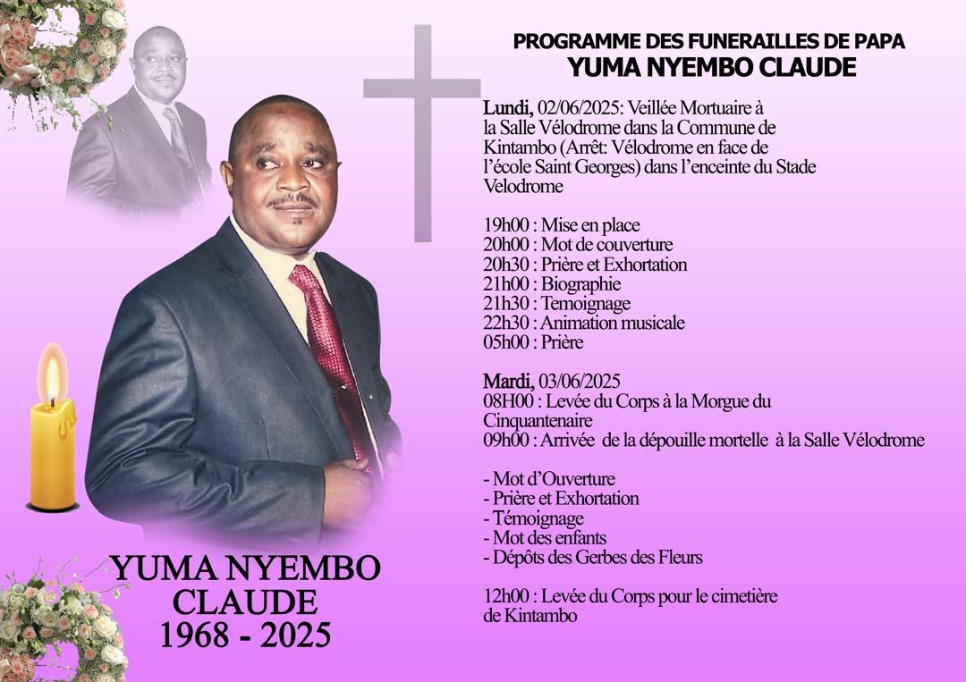 À tous ceux qui l’ont connu, aimé ou côtoyé, ce programme est une invitation au recueillement et à l’unité. Car au-delà des larmes, c’est la vie d’un homme remarquable que nous célébrons. Yuma Nyembo Claude, repose en paix. Tu as combattu le bon combat, tu as achevé la course, tu as gardé la foi.