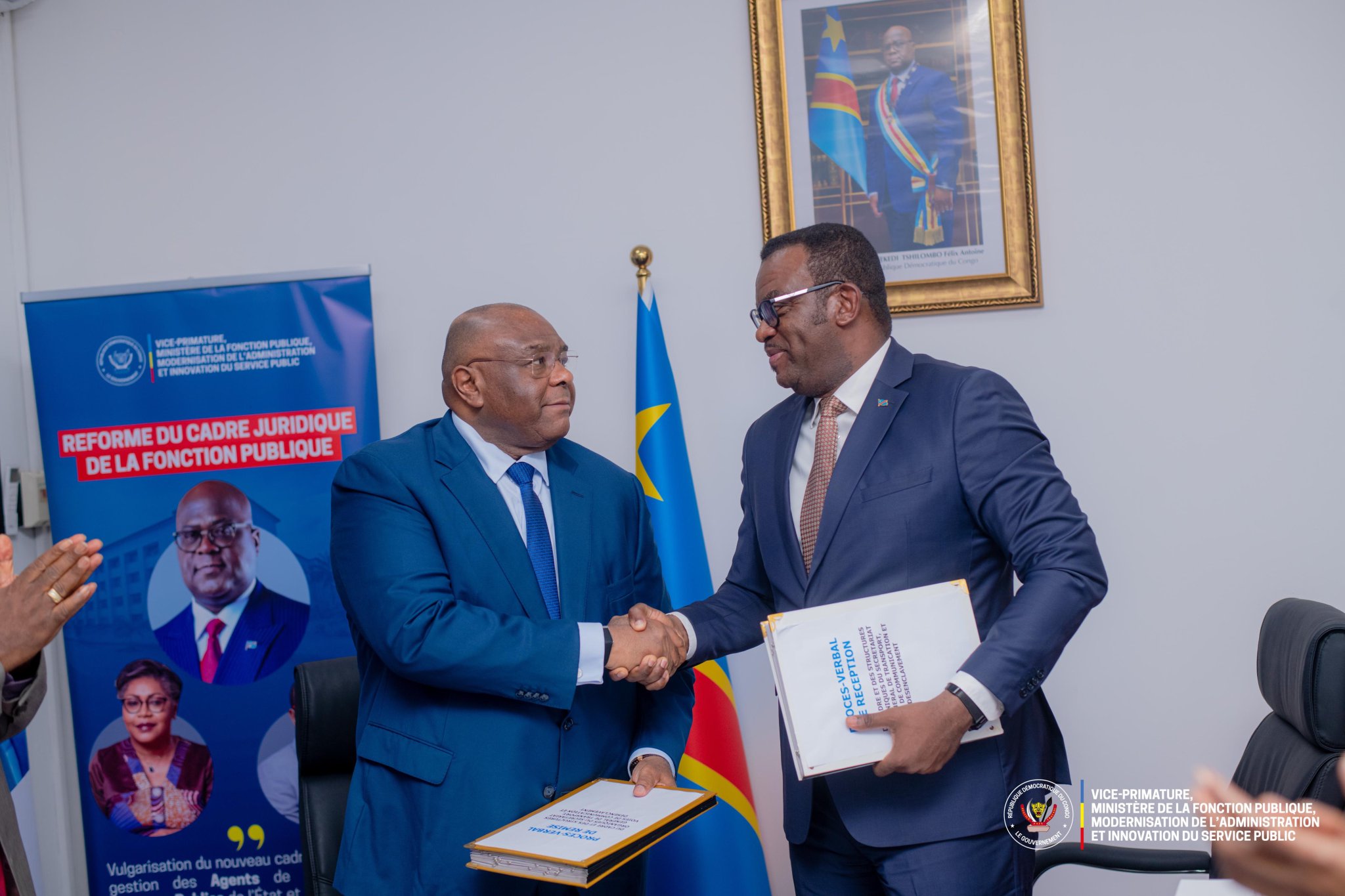 Dans la continuité de la réforme et de la modernisation de l’Administration publique, le Vice-Premier ministre, ministre de la Fonction publique, Jean-Pierre Lihau, a officiellement remis, ce jeudi 23 octobre 2025, le Cadre et les Structures organiques actualisés du Ministère des Transports, Voies de Communication et Désenclavement à son collègue, le Vice-Premier ministre Jean-Pierre Bemba Gombo.