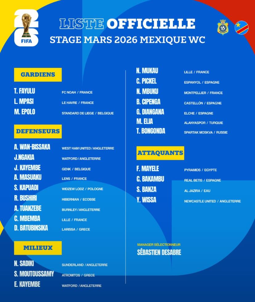L’attaque repose sur F. Mayele (Pyramids, Égypte), C. Bakambu (Real Betis, Espagne), S. Banza (Al Jazira, Émirats Arabes Unis) et Yoann Wissa, Newcastle United, Angleterre),
