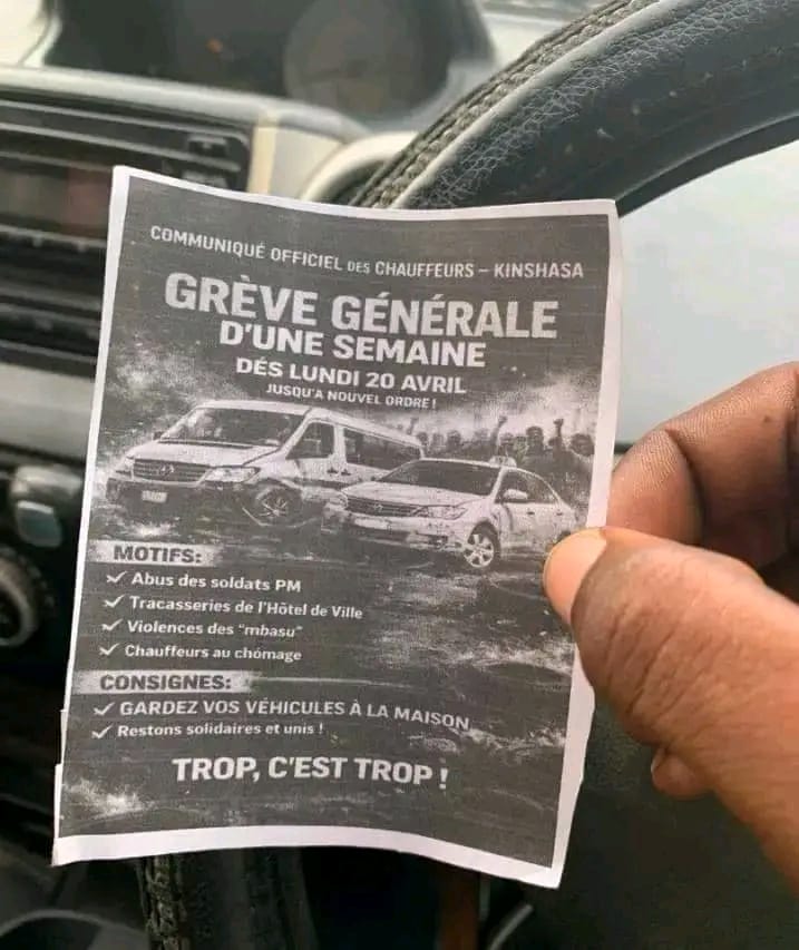 L’association des chauffeurs de transport en commun vient d’annoncer une grève d’une semaine dès ce lundi 20 avril 2026 dans la capitale de la République démocratique du Congo, Kinshasa.