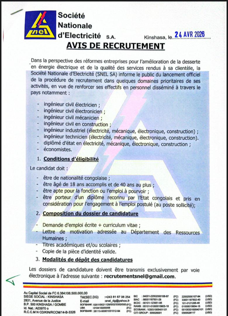 La Société Nationale d’Électricité (SNEL SA) passe à l’offensive pour consolider son appareil technique. Dans un avis officiel daté du 26 avril, l’entreprise publique annonce l’ouverture d’un recrutement destiné à renforcer ses équipes, dans un contexte de pression accrue sur la desserte énergétique à travers le pays.